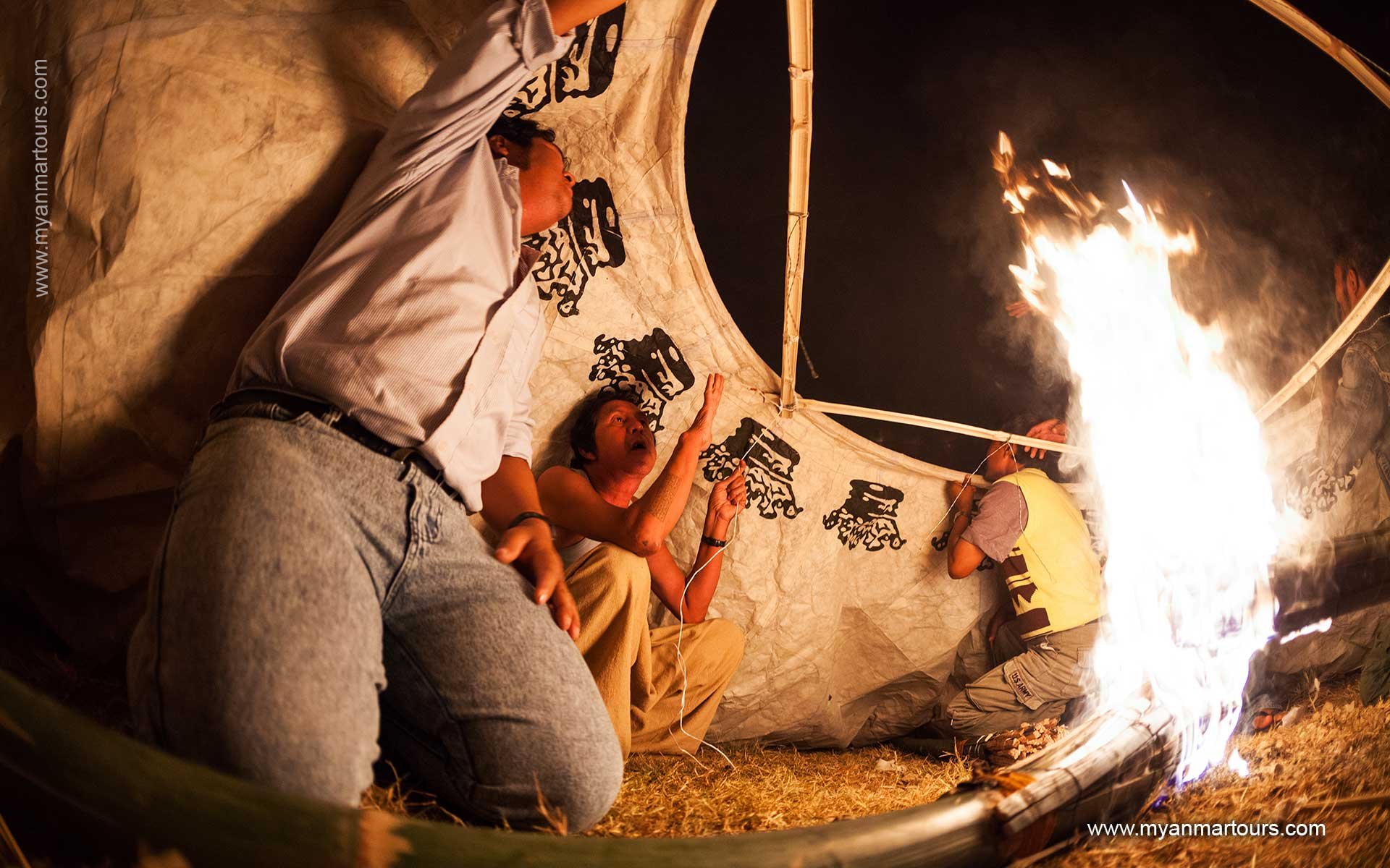 The balloons which fly into the sky sometimes carry fireworks, sometimes are filled with colorful Buddha-shaped candles. According to the concept of Myanmar people, hot air balloons with different colors, sizes and designs are released into the sky to symbolize the beautiful gifts offered to the Buddha above.